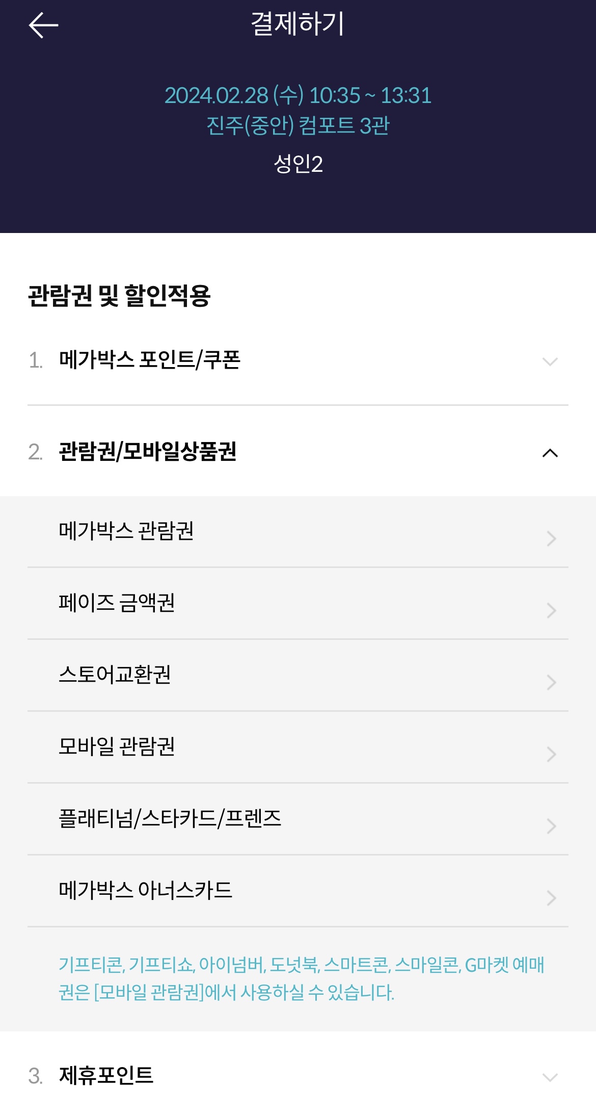 3. 메가박스 어플에서 결제를 하실 때 모바일 관람권으로 가셔서 등록한 쿠폰으로 결제하기를 하시면 됩니다.