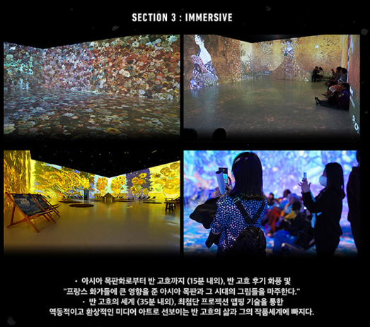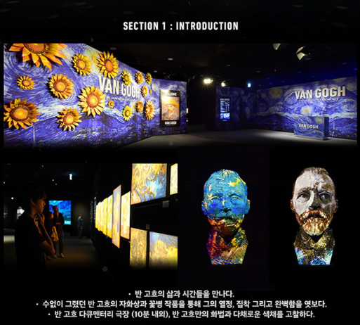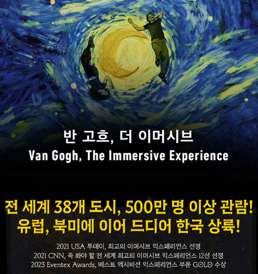 빈센트 반 고흐 몰입형 체험 미디어 전시, 유럽의 주요 도시를 거쳐 미국 및 아시아 까지 진출한 반고흐 더 이머시브 몰입형 체험전시회는 CNN 선정 최고의 몰입형 체험전시로 몰입형 공간에 들어서는 순간부터 빈센트 반 고흐 그림의 생동감 넘치고 감동적인 세계로 빠져들었습니다. 반 고흐 미디어 전시로 고해상도 프로젝션과 공간 오디오를 포함한 최첨단 기술의 사용은 이전에 경험하지 못했던 방식으로 그의 화가 작품에 생명을 불어넣는 다감각적인 경험을 만들어냈습니다.
