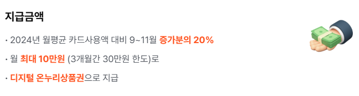 2024년 월평균 카드사용액 대비 2025년 9월 ~11월 증가분의 20% 환급해 드립니다.