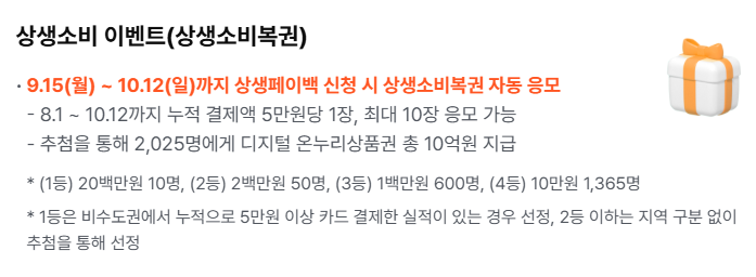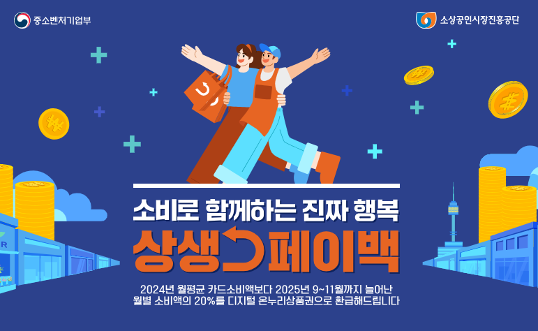 상생페이백 신청하기 소비로 함께하는 진짜 행복 상생 페이백 2024년 월평균 카드소비액보다 2025년 9월~11월까지 늘어난 월별 소비액의 20%를 온누리상품권으로 환급해 드립니다. 상생페이백 기회를 놓치지 마세요. 자세한 내용은 아래에서 확인하세요.